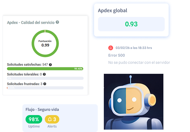 Ejecuta flujos críticos de forma constante, detecta fallas de experiencia y deja evidencia clara para actuar rápido.