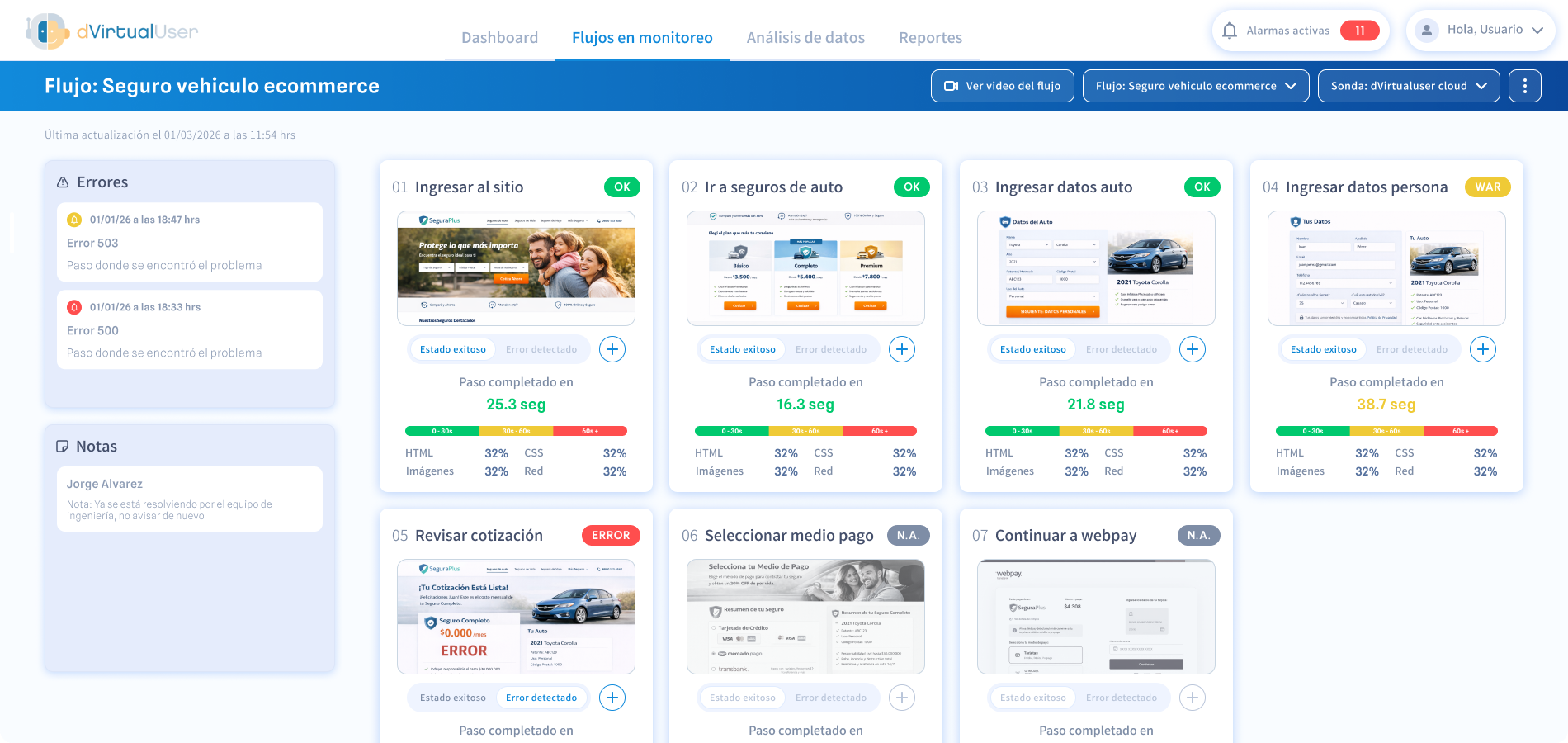 dVirtualuser valida el flujo de compra 24/7 de forma constante y alerta de anomalías antes de que se pierdan ingresos.